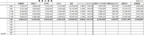 おはようございます。2024年1月の資産の推移を振り返りたいと思います。このようになりました。 米国株が堅調に推移し、資産が増加しました。特に投資信託、iDeCoで購入している楽天VTIが牽引してくれました。 線グラフで表記します。 高配当株はこんな…